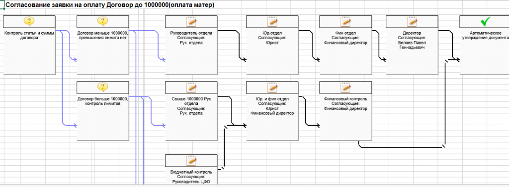 • Кейс 1: Сумма договора до 1 млн идет по последовательному маршруту: Отклик системы бюджетирования по статье бюджета отдела N – Руководитель отдела N – Юридический отдел – Финансовый отдел – Иванов Иван Петрович (директор)