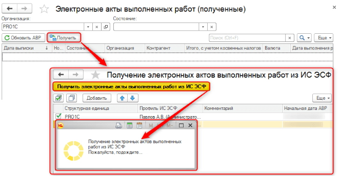 Рассмотрим теперь обратную ситуацию, в которой нужно получить конфигурацией «1С:Бухгалтерия» из «ИС ЭСФ» документ «ЭАВР», который был выписан посредствам поставщика. Сделать это можно, если открыть журнал «ЭАВР (полученные)», перейти в раздел «Покупка» и кликнуть «Получить», как можно увидеть на скриншоте с образцом ниже: