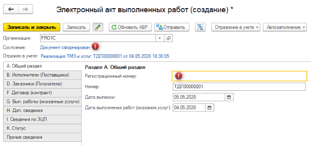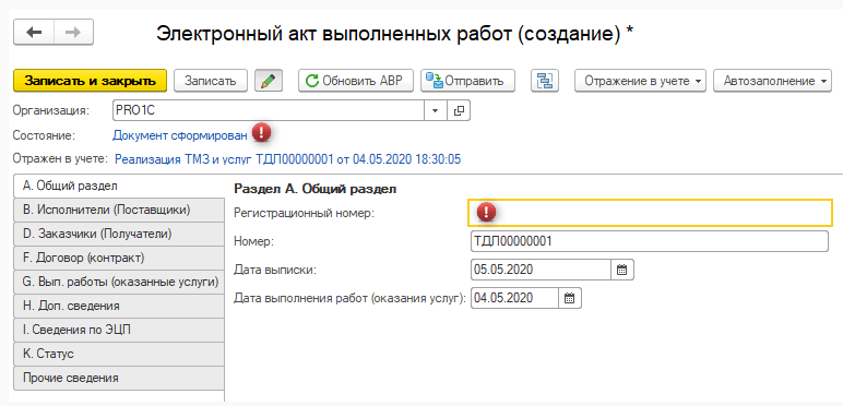 Замечание: Во время отправки «ЭАВР» на ИС ЭСФ должен иметь именно статус «Документ сформирован», при этом внутри строки «Регистрационный номер» ничего не будет, ведь, эта строка заполняется уже на сервере информационной системы.
