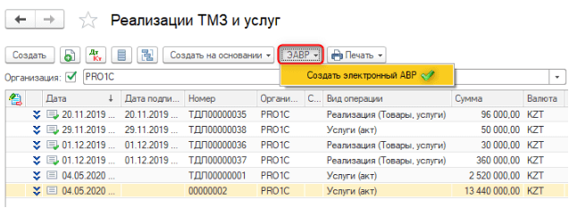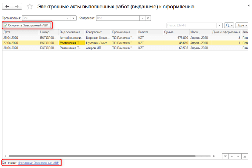 Важно отметить, что если способом выписки документа ЭАВР прописан «На портале ИС ЭСФ», тогда во время сохранения, конфигурация 1С будет считать что данному документу необходима выписка электронного акта и документ будет отображаться на рабочем месте. Теперь остаётся только избрать подходящий документ и кликнуть на «Оформить электронный АВР», после этого, данного документа на рабочем месте уже не будет.