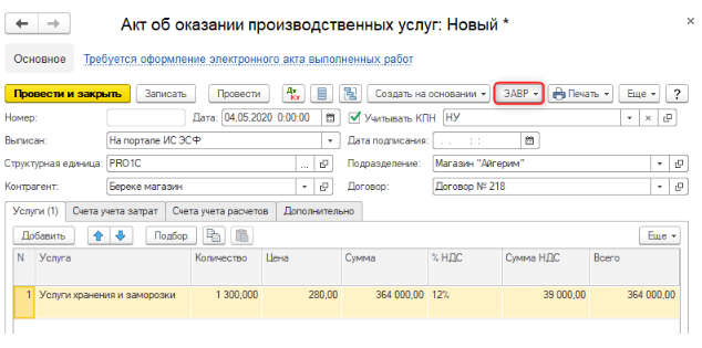 Сам акт можно сформировать прямо из документа, если кликнуть по кнопке «ЭАВР», как демонстрируется на скриншоте в примере далее: