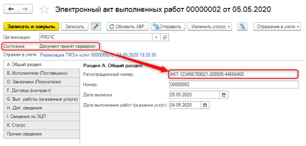 Как только отправка была успешно выполнена, то внутри поля «Регистрационный номер», соответственно, появится автоматически сгенерированный номер, а статус документа «ЭАВР» сменится на «Документ принят сервером», как можно увидеть в примере, на изображении, ниже: