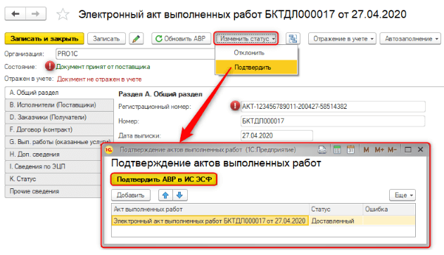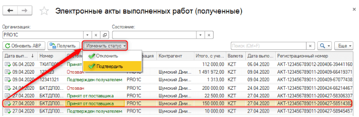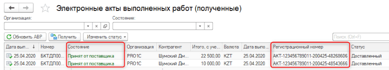 Те документы «ЭАВР», которые были загружены в систему 1С будут иметь номер регистрации, а также будут иметь статус «Принят от поставщика», как в приведённом примере далее:
