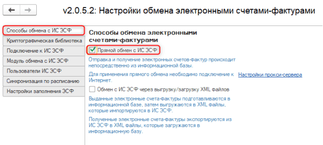 Производить обмен между сайтом ИС ЭСФ и плательщиками налогов можно при помощи конфигурации «1С:Бухгалтерия», а именно модуля «Акты выполненных работ». Получение, а также отправка актов о выполненной работе происходит при помощи прямого обмена данными. Настроить можно в самой конфигурации «1С:Бухгалтерия» , открыв вкладку «Способы обмена с ИС ЭСФ» и проставив «галочку» около пункта «Прямой обмен с ИС ЭСФ», как показано на скриншоте с примером ниже: