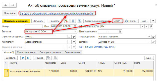 В статье будет описано, как оформлять, настраивать и редактировать электронный акт выполненных работ (ЭАВР) в конфигурации 1С Бухгалтерия для Казахстана.