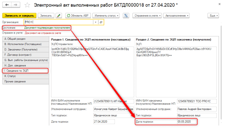 Также, отдельное внимание следует обратить на даты и подписи внутри документации по учёту. Так как, если документ «ЭАВР» подлежал подписи заказчика, тогда система 1С будет проводить анализ документа учёта, который имеет связь с заданным актом, если конкретнее, то: