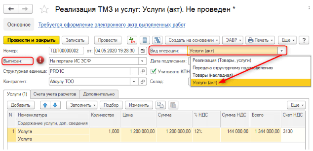 Важно, что б был указан вид выписки, то есть сама строка «Выписан» должна быть активной только в документе «Реализация ТМЗ и услуг», при этом, внутри его строки «Вид операции» прописано «Услуга (акт)», как можно увидеть на нижеприведённом скриншоте далее. Так происходит из-за того, что внутри модуля ИС ЭСФ АВР есть только данные по сделанных работах и услугах, если же имела место быть только продажа продукции, то ЭАВР делать не нужно.