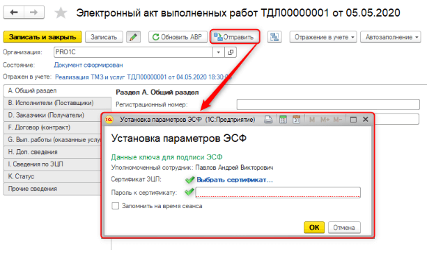 Чтобы отправить «ЭАВР» из конфигурации «1С:Бухгалтерия» в «ИС ЭСФ» необходимо открыть сам документ «ЭАВР» и кликнуть на «Отправить», важно не забывать о привязке электронной подписи и пароля, окно с параметрами для отправки показано на картинке далее: