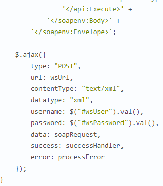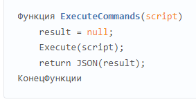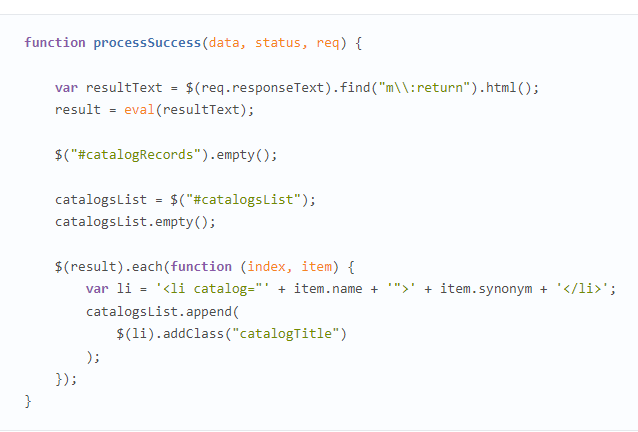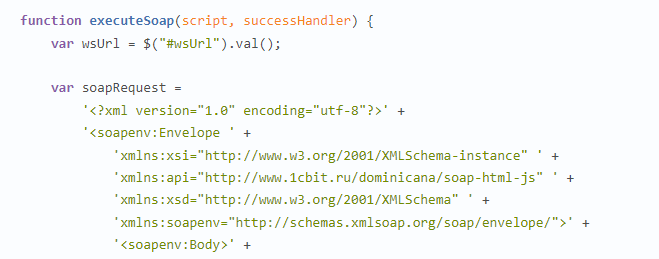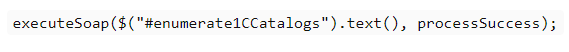 ЕxecuteSoap-қа кірген кезде 1С-сценарий беріледі, ол 1С жүйесінің конфигурациясы жағынан орындалды, сонымен қатар өңдеуші де беріледі. Егер кенеттен қате пайда болса, онда өңдеушіге- processError-ге хабарлассыңыз, ол қате туралы хабарламаларды шығаруға жауап береді. Бұл жағдайда 1С коды HTML кодының ішінде script тегінің көмегімен жазылғанын түсіну маңызды. Кодтың кез-келген бөлігінің мәтінін көрсету үшін jQuery конструкт($("#enumerate1CCatalogs").text() дизайнын пайдалану керек.
