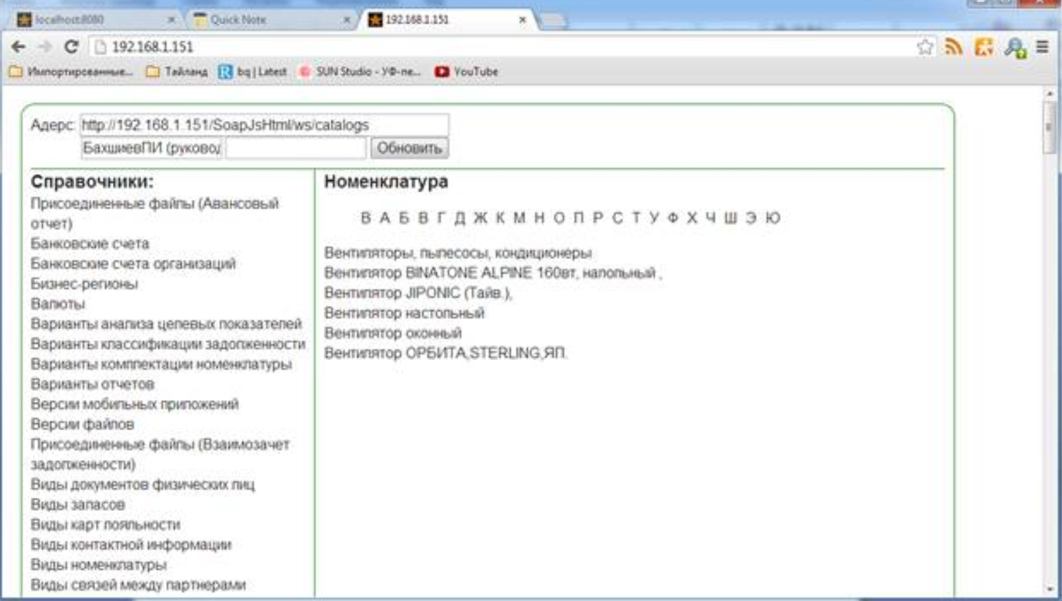 Логин мен пароль 1С пайдаланушымен сәйкес келуі керек. Сол жақтағы панельде қол жетімді анықтамалықтар болады-бұл catalogsList, ал оң жақта catalogRecords деректері, сондай-ақ әріптер көрсетіледі.