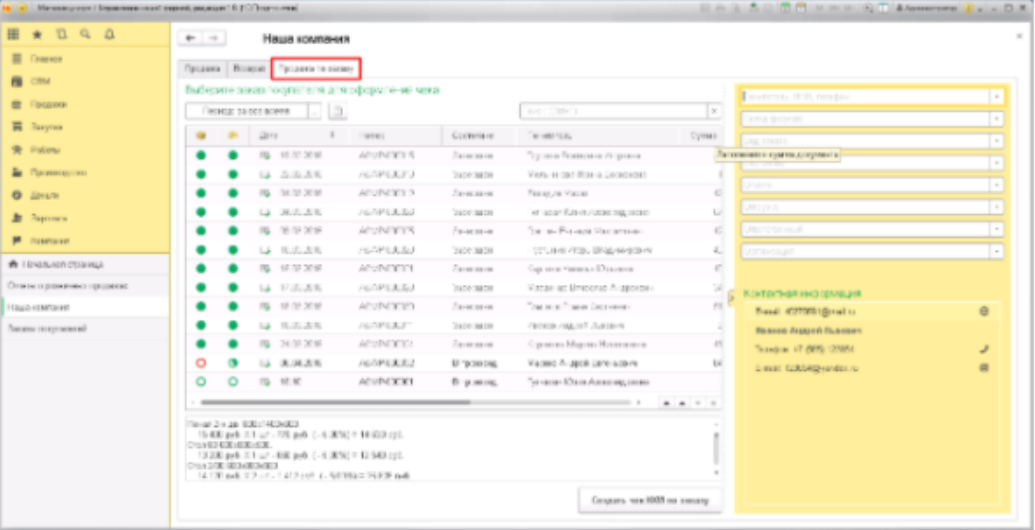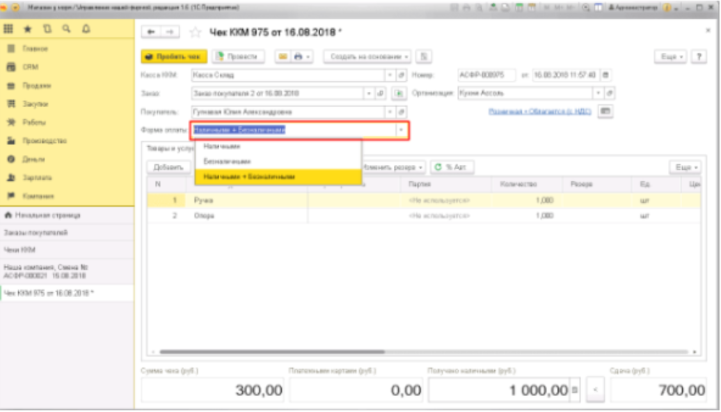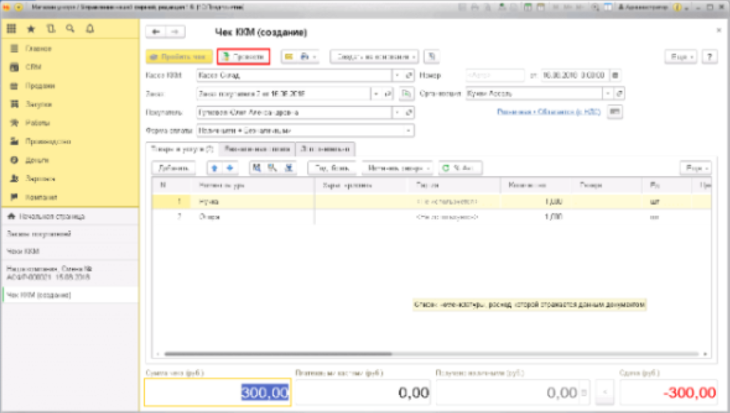 Жоғарыда сипатталған "сатып алушының тапсырысынан" чек құрудың нұсқасы тек осы операцияны орындайтын пайдаланушының 1С жүйесінің конфигурациясында толық құқықтары болған жағдайда ғана жүзеге асырылуы мүмкін. бірақ, әдетте, чектермен айналысатын кассирлерде мұндай кеңейтілген қол жетімділік мүмкіндіктері жоқ. Ол үшін RMK (кассирдің жұмыс орны) арқылы арнайы әдіс бар. Кассирге қолма – қол ақшасыз төлем бойынша чекті тесуді орындау үшін кассирдің RMK-дағы "сату" панеліне кіру керек, оны келесіден көруге болады: