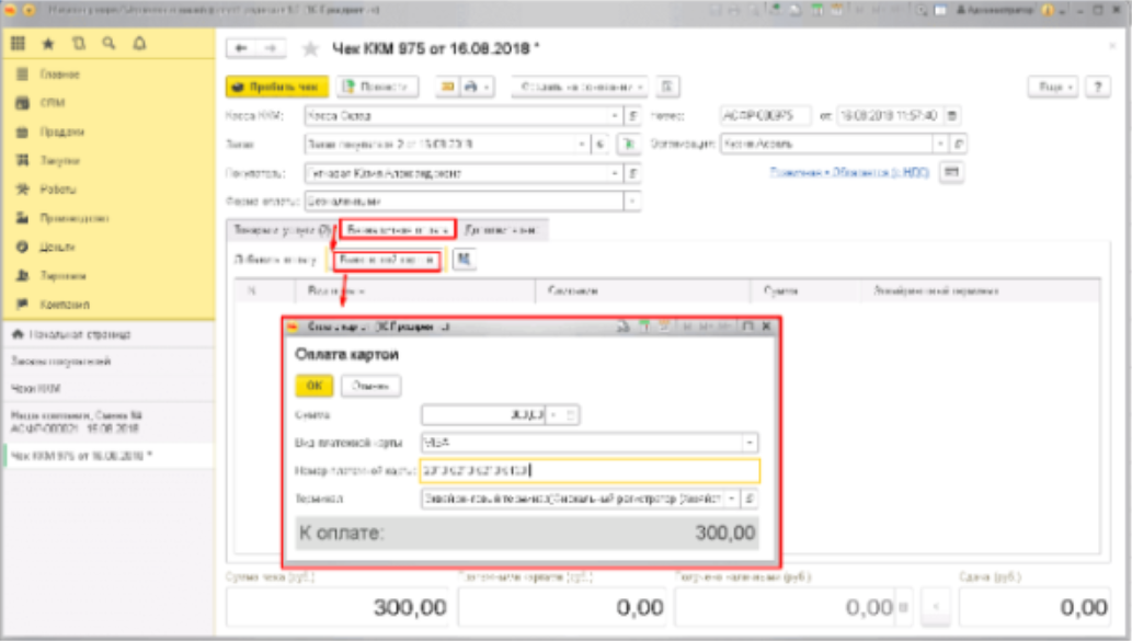 Енді кассирге "қолма-қол ақшасыз төлем" қойындысын таңдау, ондағы "банк картасын" таңдау ғана қалады, содан кейін жүйе карта мен төлем мөлшері туралы мәліметтер енгізілетін "картамен төлеу" терезесін іске қосады. Барлығы толтырылғаннан кейін - "ОК"батырмасын басыңыз:
