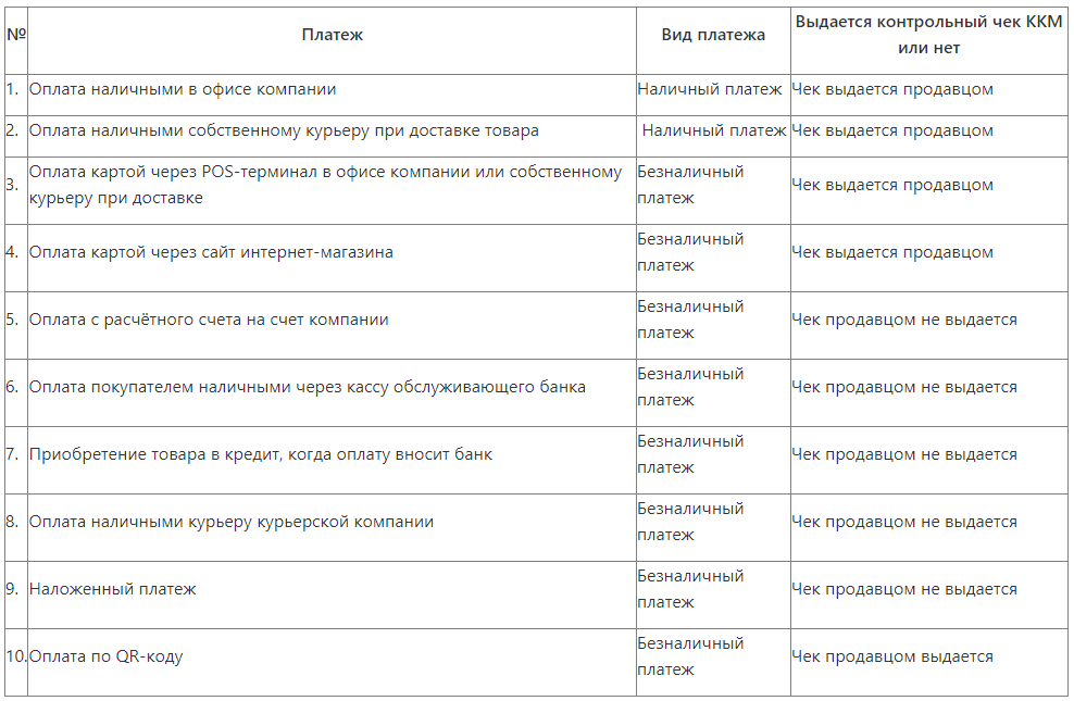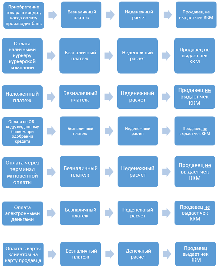 Мұнда ақшалай есеп айырысулармен мүмкін болатын операциялардың схемасы және әрбір нақты жағдайға қатысты фискалдық кассалық чек жасау қажеттілігі көрсетілген: