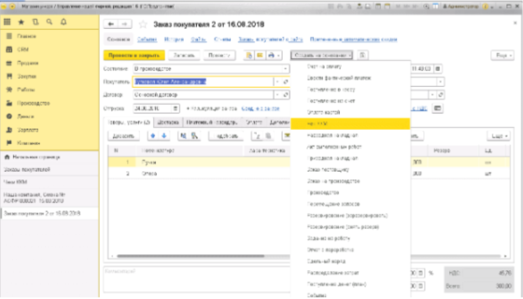 Чектің өзі "сатып алушының тапсырысы" құжатының ішінде пайда болады, онда "негізде жасау" батырмасын басу керек, содан кейін біздің алдымызда "БКМ чегі"жолын таңдайтын тізім пайда болады. Әрі қарай, қажетті мәліметтерді толтырғаннан кейін, чек автоматты түрде, 1С жүйесінің конфигурациясын қолдана отырып, бұзылады. Әрі қарай, 1С бағдарламасының жүйесінде чек құру қалай көрсетілетіні көрсетілген: