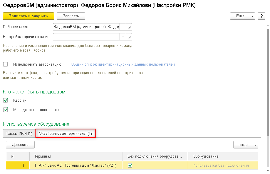 Сондай-ақ, эквайринг терминалдарын кассирдің орнымен байланыссыз пайдалануға болады, бірақ ол үшін скриншотта көрсетілгендей "жабдық қосылмаған" белгісін таңдау керек-мысал келесіде: