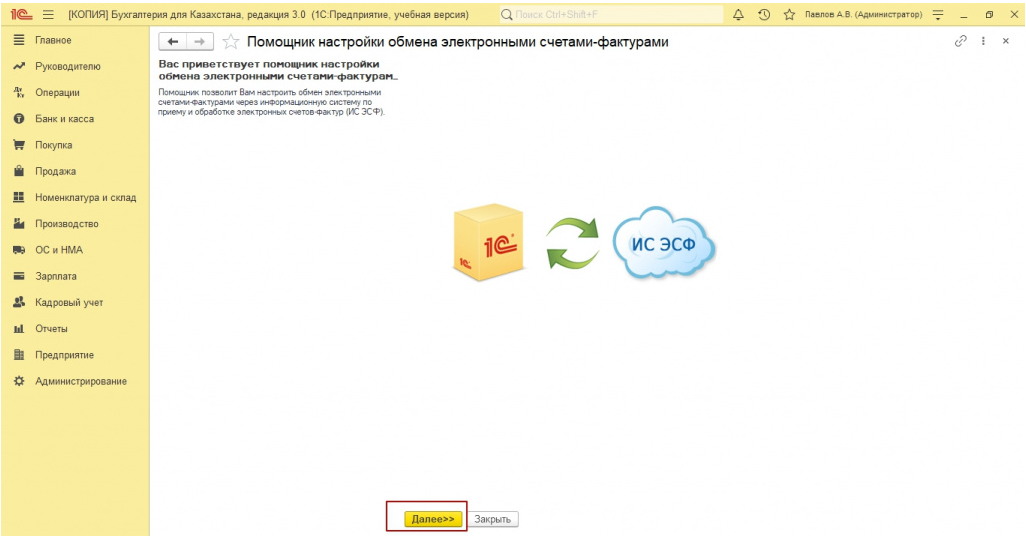 Осы әрекеттен кейін ҚР электрондық шот-фактуралары бойынша параметрлерді қамтитын жаңа терезе іске қосылады," Келесі " батырмасын басамыз, бұдан әрі көруге болады: