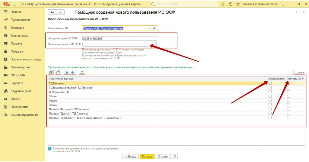 Әрі қарай, ЭСФ электрондық шот-фактуралары үшін 1С пайдаланушы параметрлерін ашу керек, онда ЭСФ АЖ порталына кіру үшін біздің деректерімізді пайдалану қажет болады: