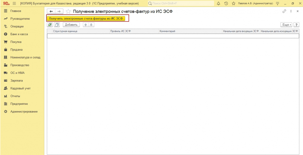 Осыдан кейін, ЕСФ электрондық шот-фактураларына жауап беретін 1С жүйелік конфигурациясының ішіндегі модульді пайдалануға болады: