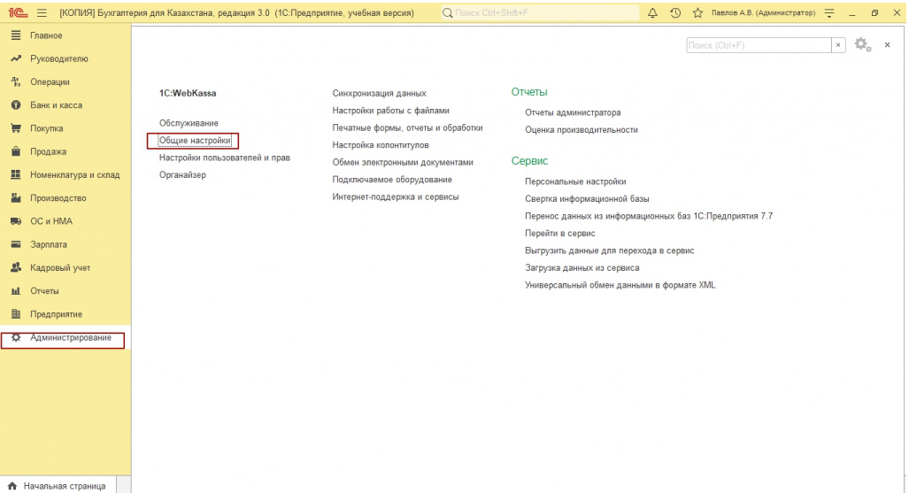 1С жүйесінің конфигурациясының ішінде ЭСФ жұмысына жауап беретін арнайы модуль бар, атап айтқанда – жоғарыда сипатталған ЭСФ АЖ порталымен байланысты. Осы модульдің көмегімен ҚР электрондық шот-фактуралары жіберіледі, олардың алмасуы, сондай-ақ оларды алу жүзеге асырылады. Бұл модульді іске қосу үшін-1С жүйесінің конфигурациясының ішіндегі "әкімшілік" тақтасына өтіп, төмендегі скриншотта көрсетілгендей "жалпы параметрлерді" нұқыңыз:
