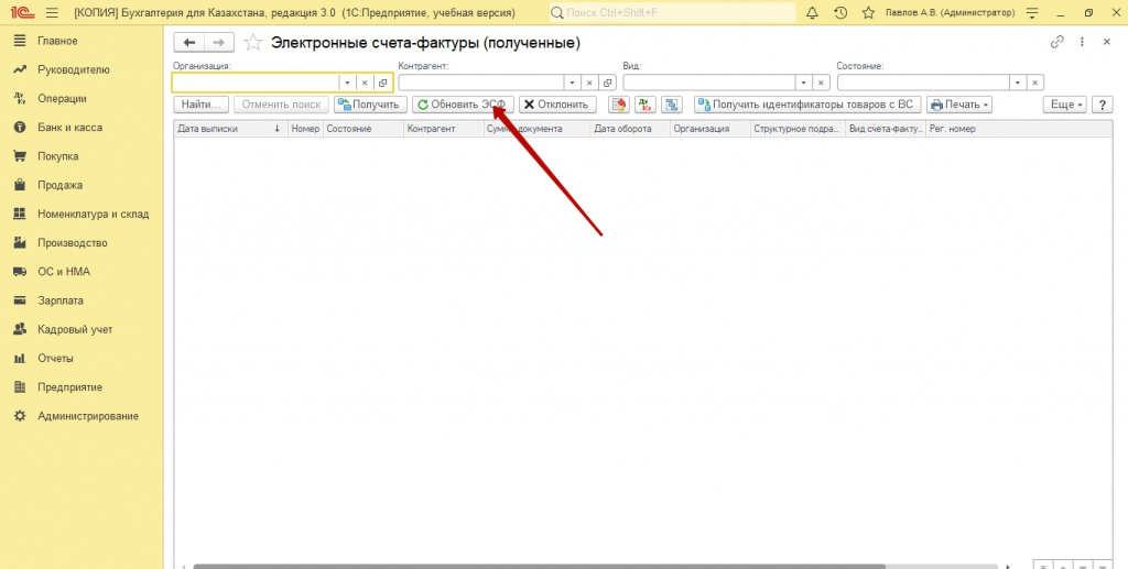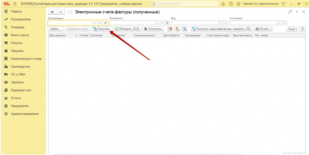 ЭСФ КЗ электрондық шот-фактураларын алу үшін-пайдаланушыны таңдап, 1С жүйесінің конфигурациясының "электрондық шот-фактуралар" панеліндегі "алу" батырмасын басу қажет.