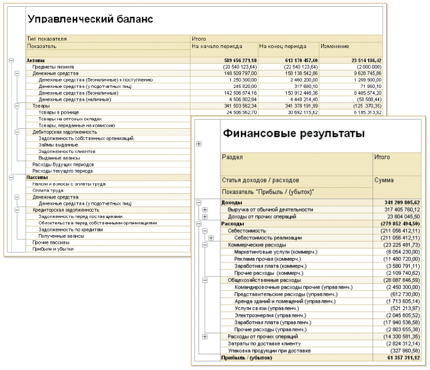 Басқару балансы және ол бойынша қаржы нәтижелері осы 1С ішкі жүйесінде көрінеді: ERP келесідей болады: