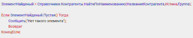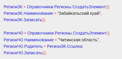 Егер анықтамалықтың жаңа элементі нақты, бар топқа қатысты болса, қажетті элемент үшін «ата-ана» сипатын ашып, оған тиесілі топқа сілтеме енгізу керек. Әрі қарай, жаңа топқа жататын жаңа элементтің жасалуын көрсететін 1С бағдарламалық кодының мысалы келтірілген: