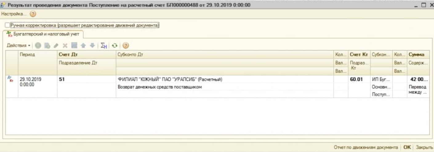 Сондай-ақ, қате аударылған ақша қаражатын қайтару жағдайында, одан әрі проблемаларды болдырмау үшін, қайтару бойынша 1С барлық сымдарды тексерген жөн. Ол үшін қолданыстағы сымдар бойынша талдау бар. Бұл талдауды көру үшін-біздің құжатты таңдап, «Дт Кт» батырмасын басыңыз, оны келесіде көруге болады: