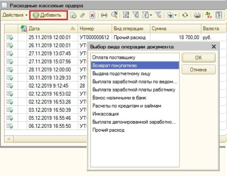 2. Төменде скриншоттағыдай 1С шығыс кассалық ордерінің түрін «сатып алушыға қайтару» деп таңдау керек: