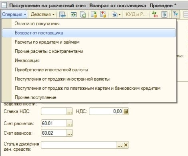 3. 1С конфигурациясында жеткізушіден ақша қаражатын қайтару
