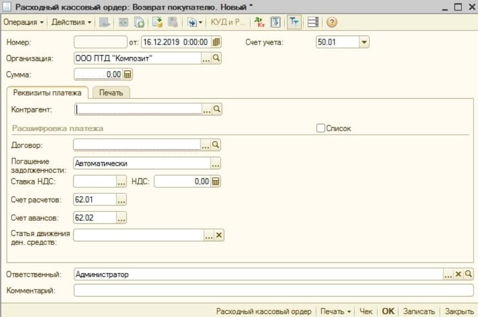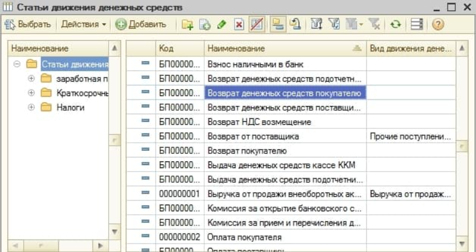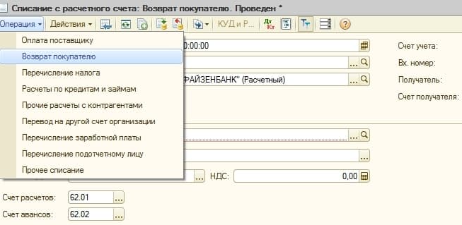 3. Соңында, біз барлық деректемелердің дұрыс толтырылғанын салыстырамыз, содан кейін біз мысалдағыдай 1С-тағы ақша ағынының мақаласы ретінде «сатып алушыға ақшаны қайтаруды таңдаймыз»: