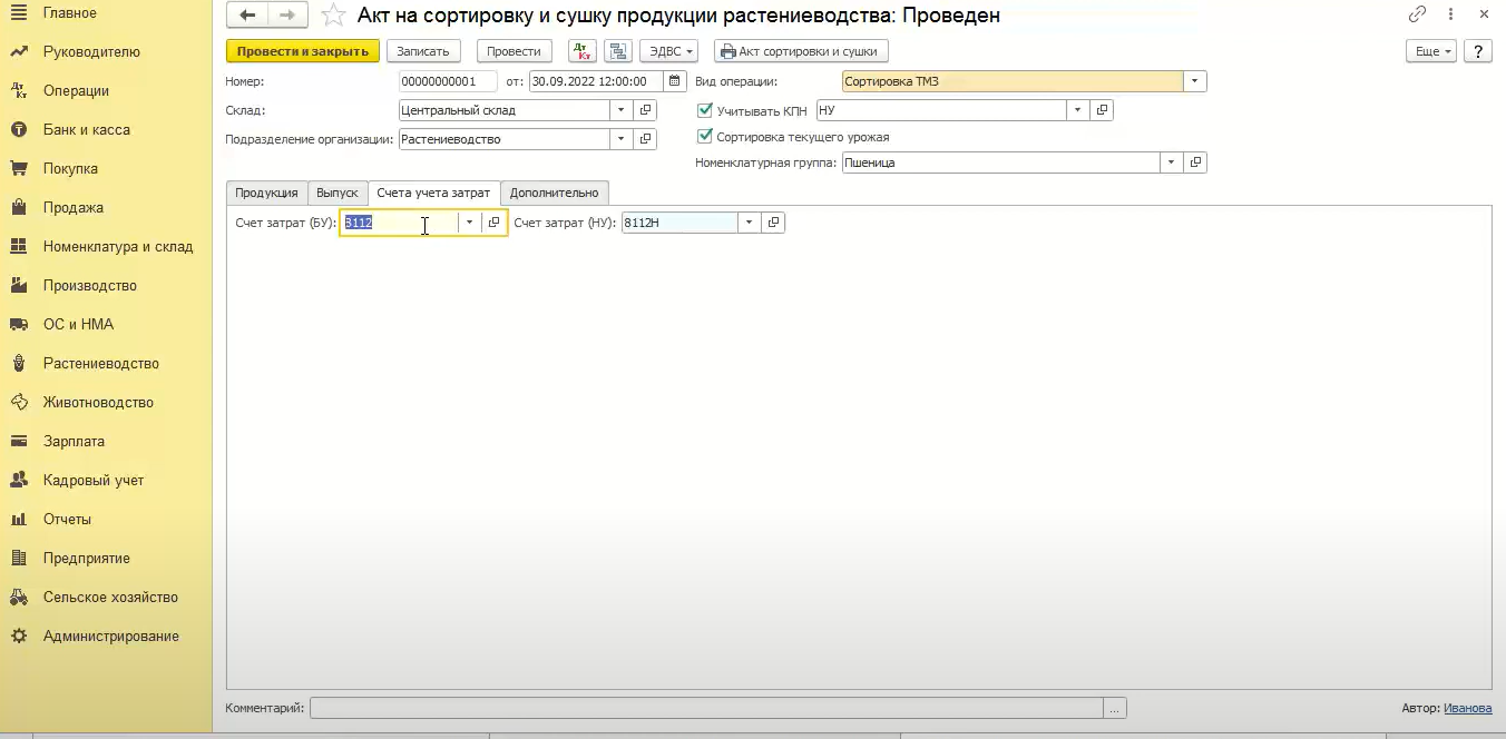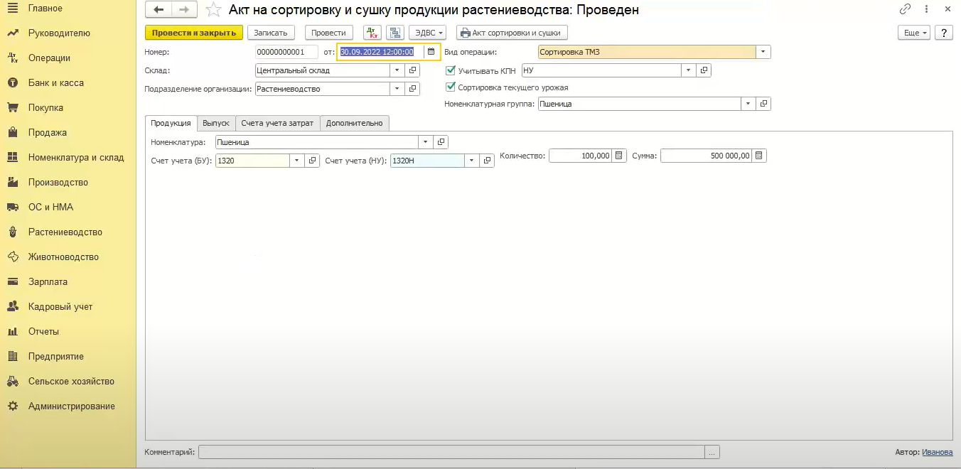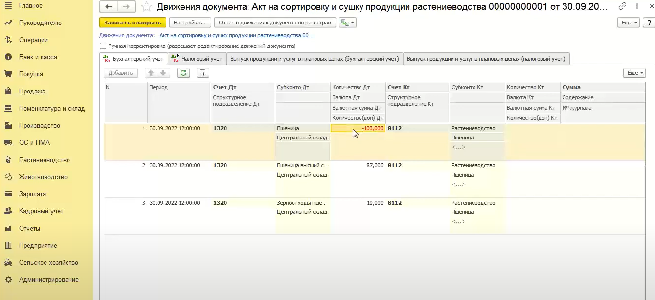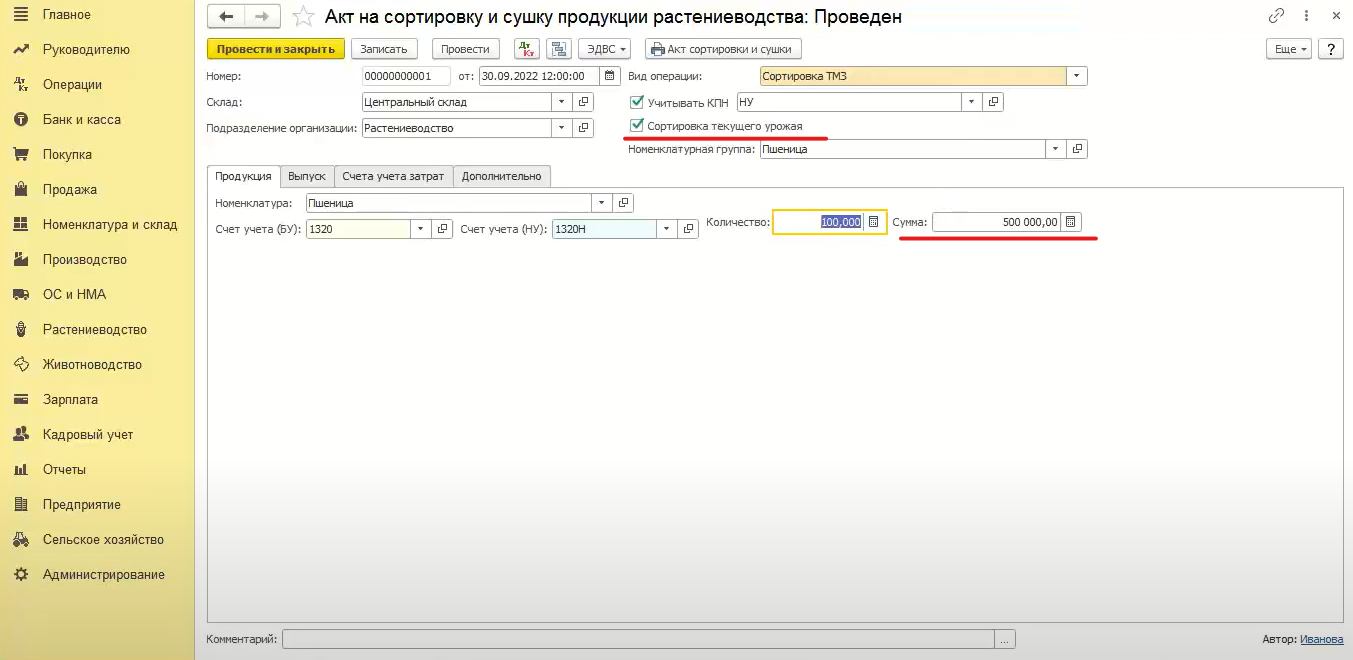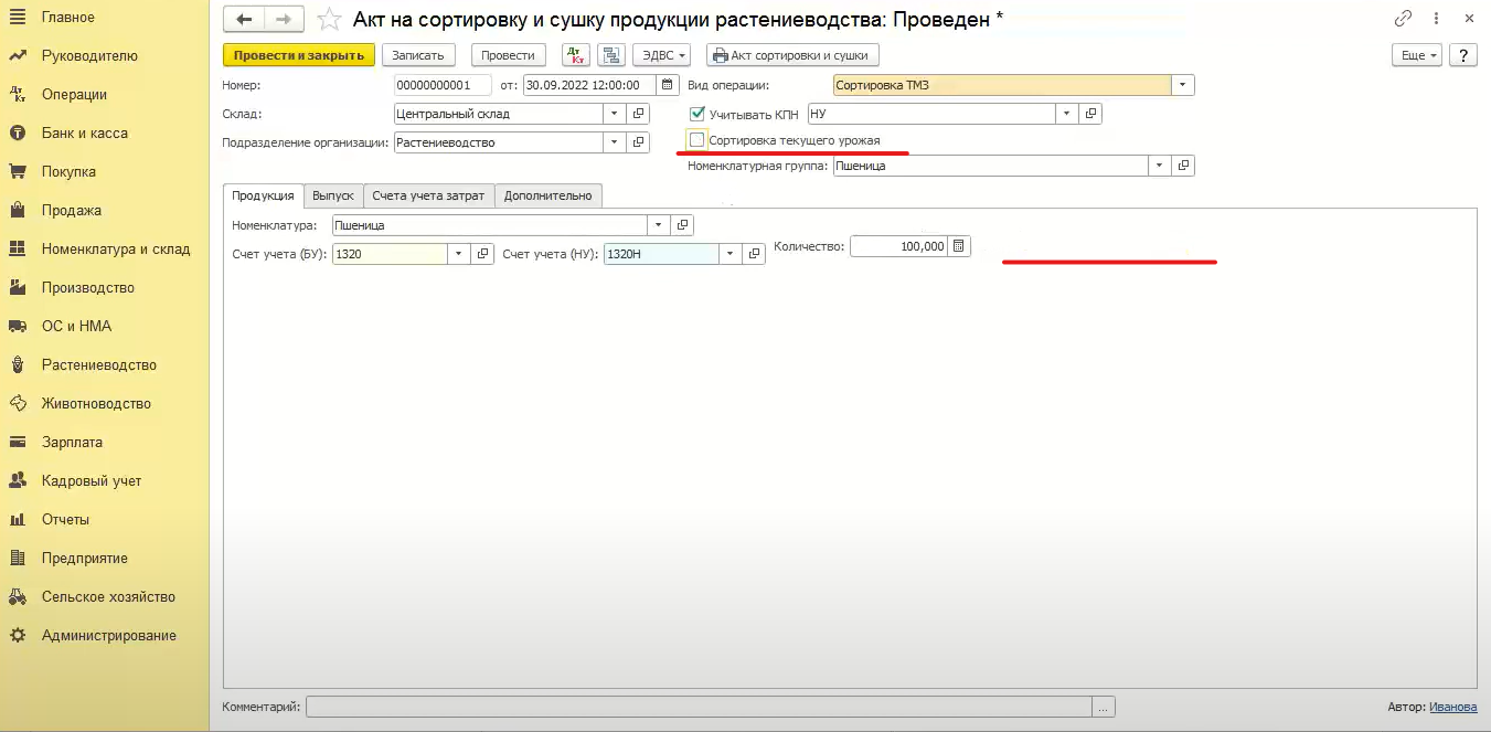 На что же влияет данная галочка. При проведении документа с применением сортировки текущего урожая происходит проводка методом красный сторно. Если в текущем месяце была оприходована пшеница (грязное зерно), то при помощи признака «сортировка текущего урожая» происходит сторнирование этого зерна и вместо него происходит процесс оприходования пшеницы высший сорт и зерноотходов пшеничных.