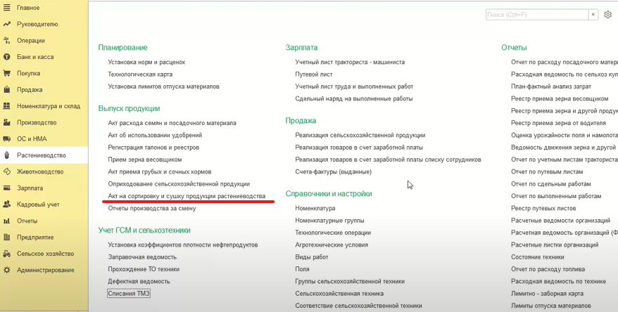 Создание документа. В программе «1С: Предприятие 8» необходимо перейти в раздел «Растениеводство» и выбрать «Акт на сортировку и сушку продукции растениеводства».