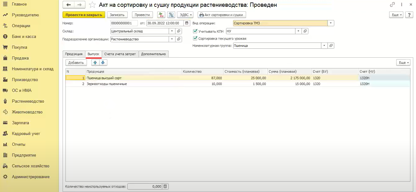 В этом же документе во вкладке «Выпуск» пользователь может оприходовать то зерно, ту продукцию, которая вышла после подработки. Не нужно отдельно проводить списание, а потом отдельным документом оприходовать продукцию после подработки. Соответственно, создавать акт на сортировку и сушку продукции нужно создавать уже после того, как продукция пришла с сушки.