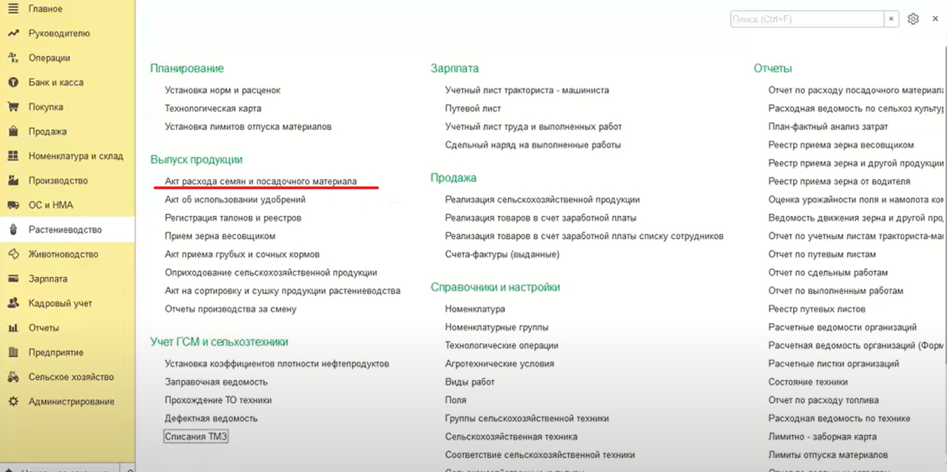 В программе 1С: Предприятие 8 необходимо перейти в раздел «Растениеводство» и выбрать «Акт расхода семян и посадочного материала».
