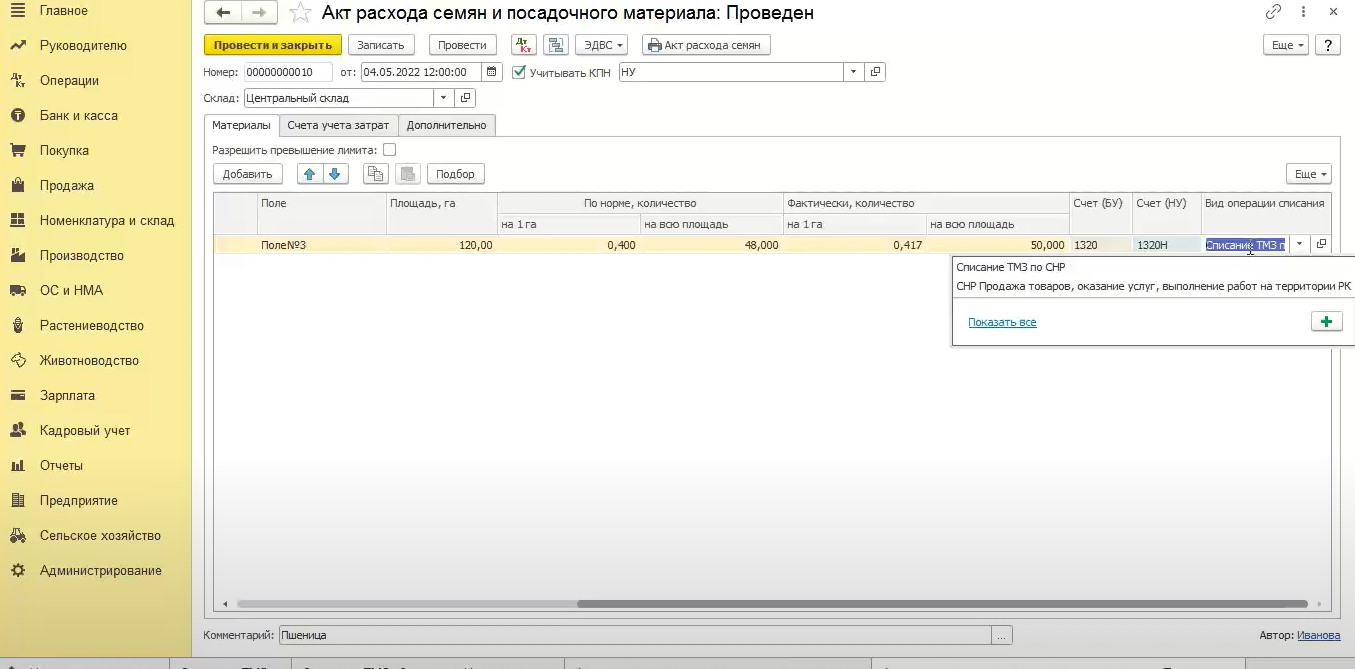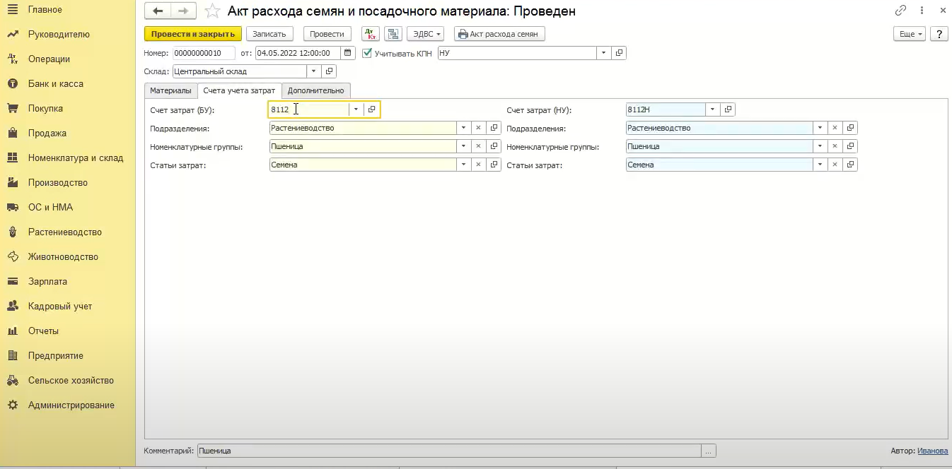 - Бухгалтерские данные по списанию семян. То есть на какой счет происходит списание семян и аналитика по нему.