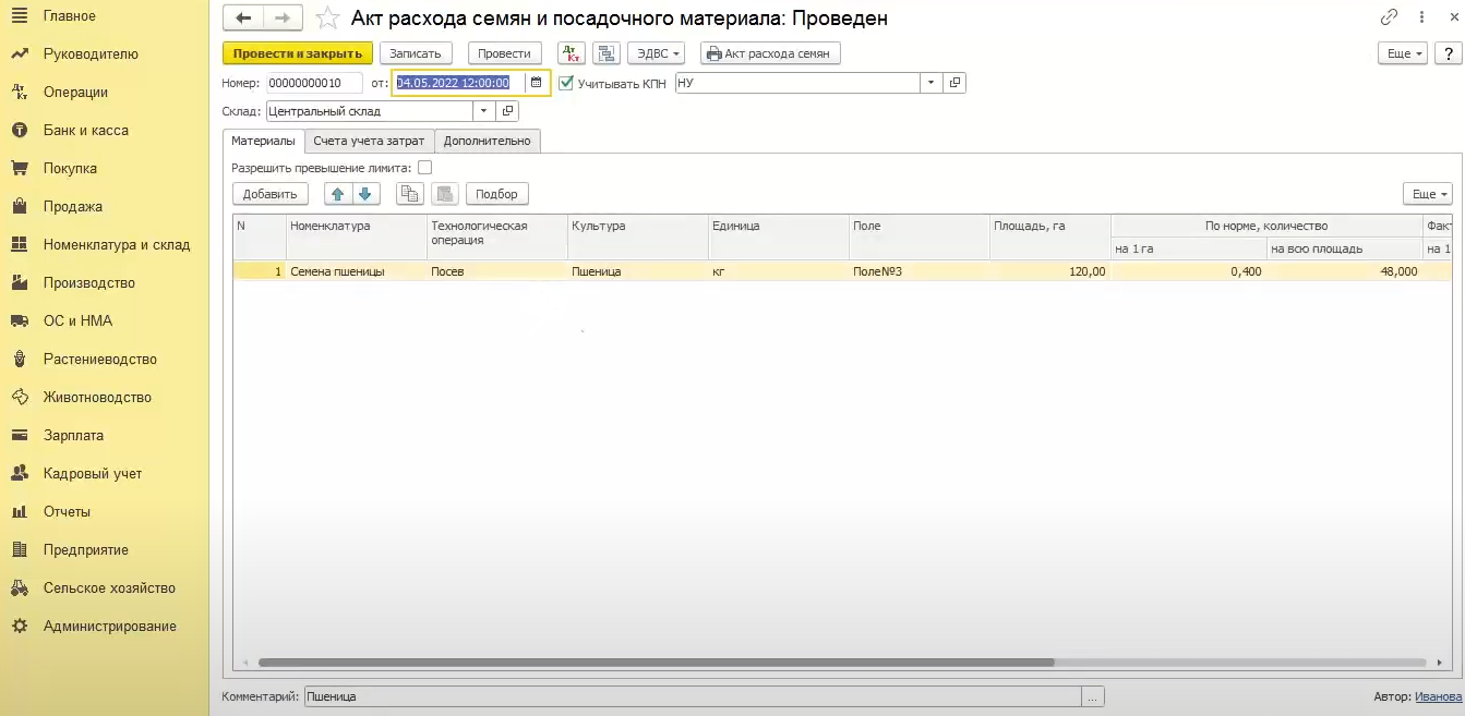 После ввода всех необходимых данных документ «Акт расхода семян и посадочного материала» проводится.