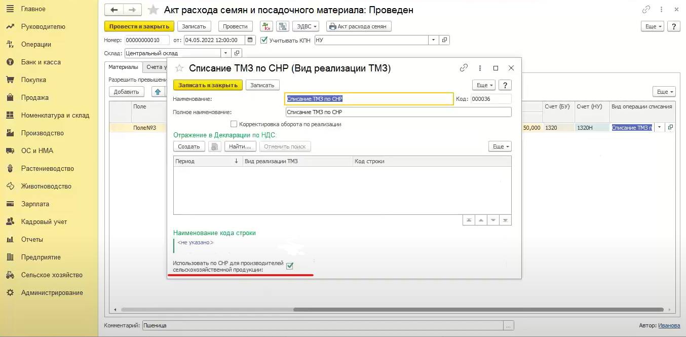 - Вид операции списания. Данный реквизит заполняется, если компании необходимо, чтобы все данные списывались согласно двух режимов: СНР (Специальный Налоговый Режим для сельскохозяйственных производителей) или общая система без льгот. То есть данный реквизит показывает по СНР или нет происходит списание материалов, и если да, то в дальнейшем при анализе будет идти как «Списание по СНР».