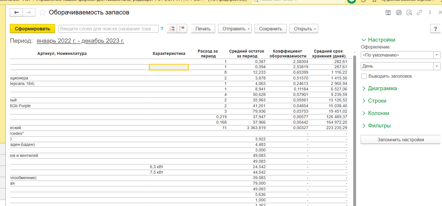· Оборачиваемость запасов – в данном отчете отображается коэффициент оборачиваемости по номенклатуре;