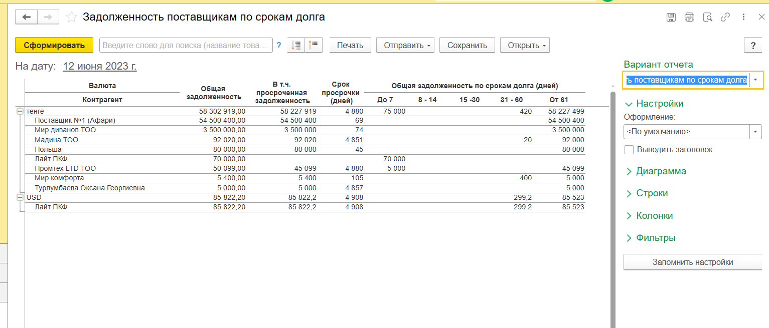 · Задолженность поставщикам по срокам долга – В данном отчете показывает задолженность и просроченную задолженность поставщиком по срокам долга. Подобный отчет есть и в подсистеме Продажи;