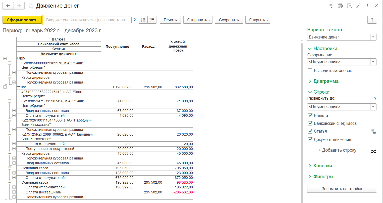 Движение денег – в данном отчете отображается информация по движению денежных средств по статьям расходов с детализацией до регистратора;