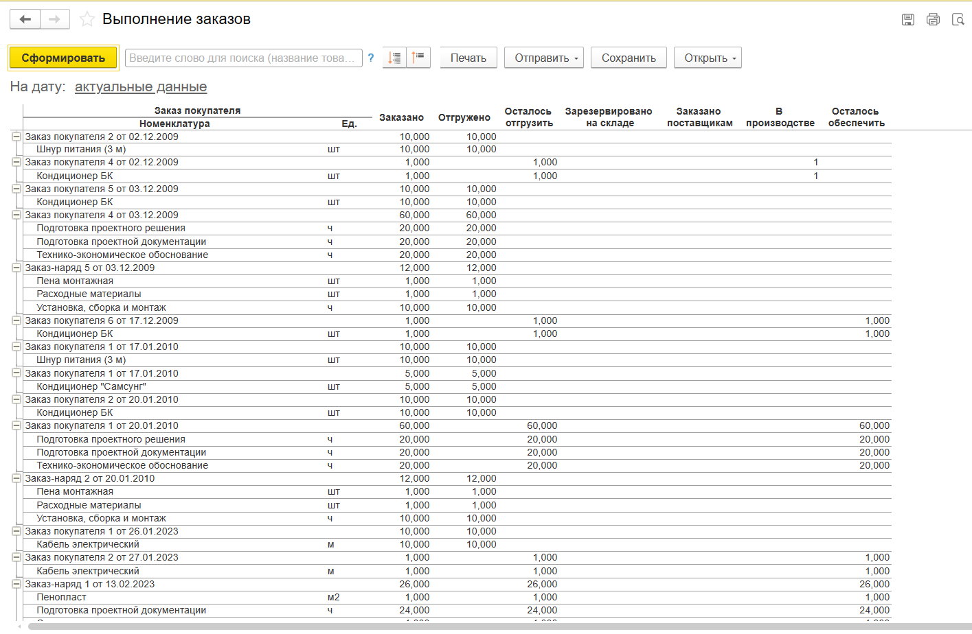 · Выполнение заказов – в данном отчете отображается информация по выполнению заказов, сколько товаров заказано, сколько отгружено, сколько осталось отгрузить;