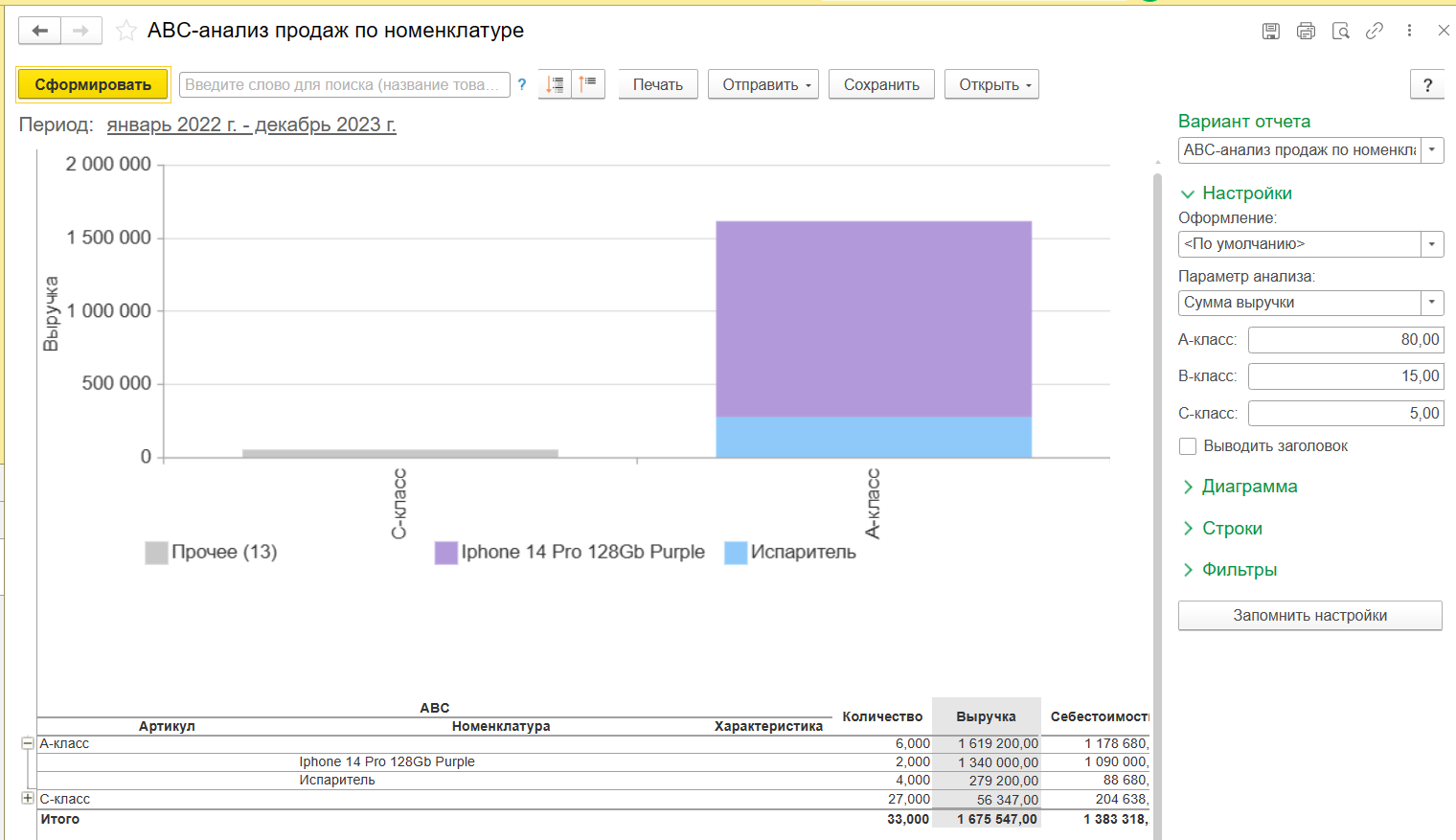 · ABC - анализ продаж по номенклатуре – Данный отчет отображает классифицированную в классы информацию о продажах номенклатуры;