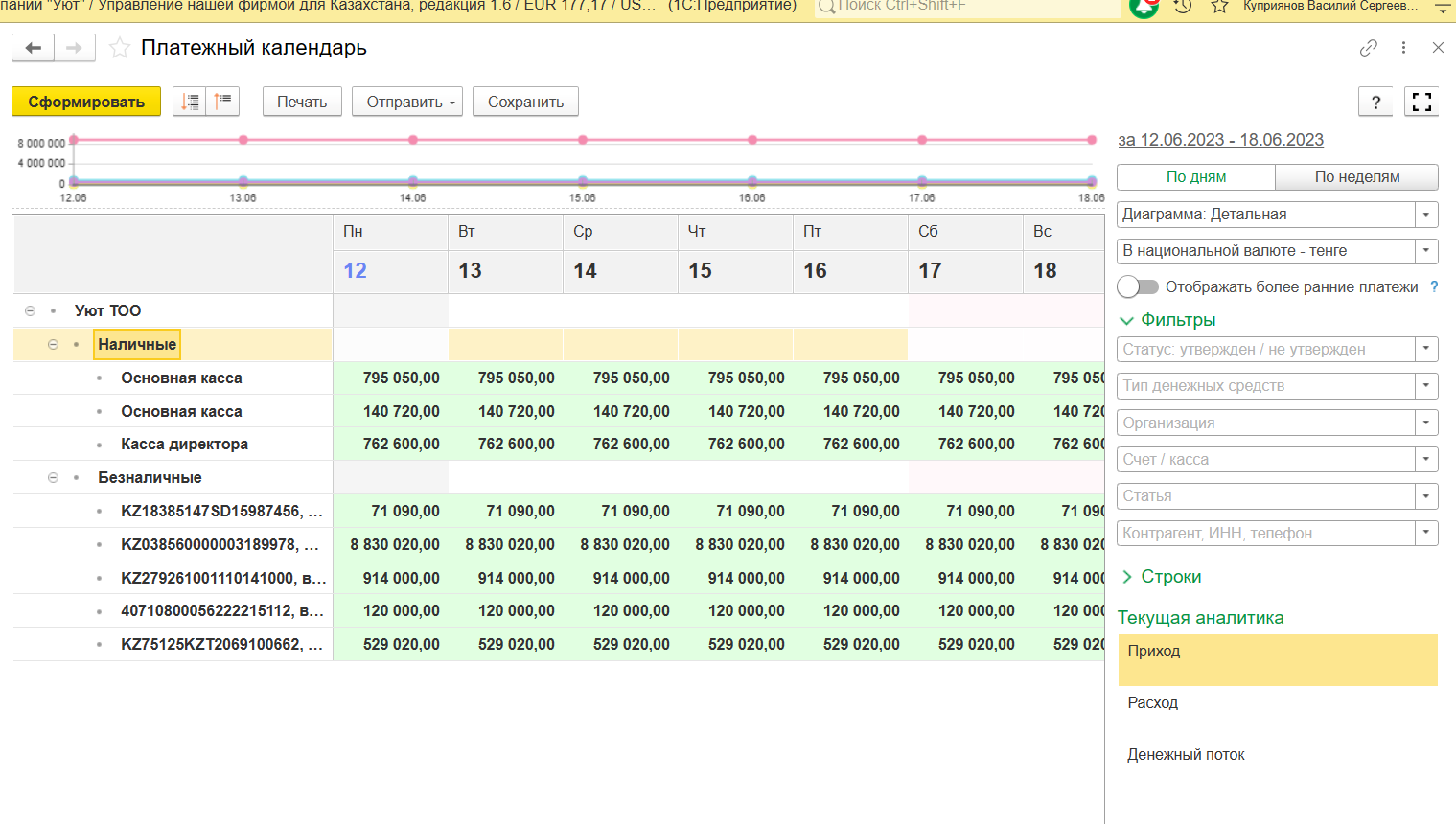 Платежный календарь – с помощью данного отчета можно не допустить возникновение кассового разрыва бюджета на основании данных о планируемых поступлений и списаний денежных средств 1С;