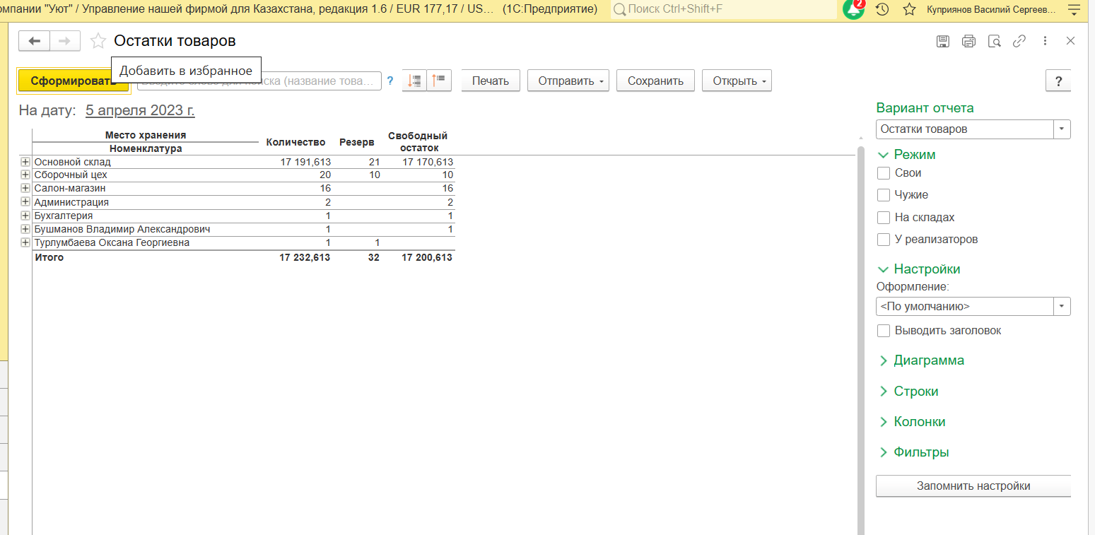 · Остатки товаров – Данный отчет показывает остатки товаров на определенную дату. Также данный отчет показывает резервы по товарам и свободный остаток товара;