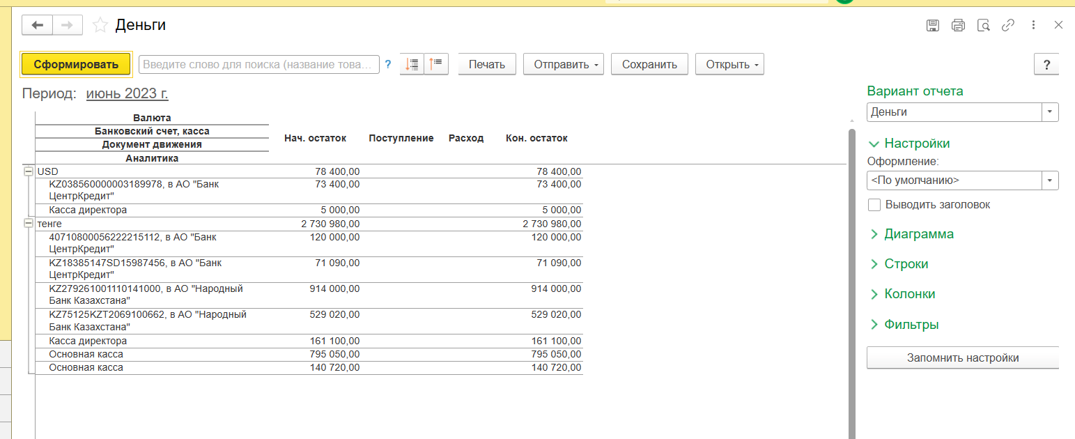 · Деньги – в данном отчете отображаются остатки и обороты по денежным средствам на кассах и банковских счетах.