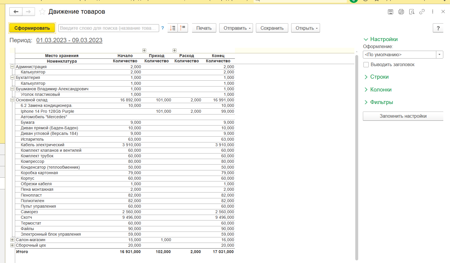 · Движение товаров - данный отчет отображает остатки и обороты по количеству товара в номенклатуре;
