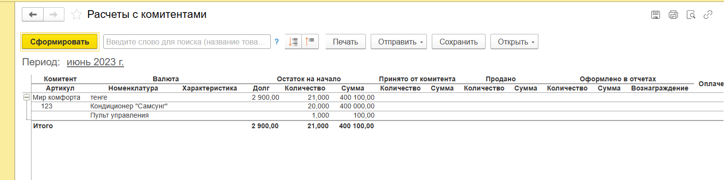 · Расчеты с комитентом – в данном отчете отображается информация по принятым товарам от комитента, сколько комиссионных товаров было продано, сумма комиссионного вознаграждения, сумма расчетов;