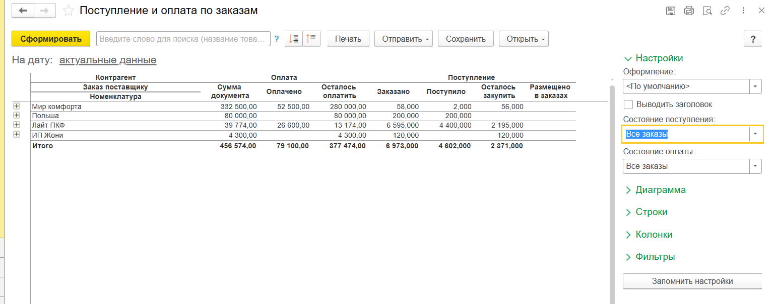 · Поступление и оплата по заказам – данный отчет позволяет контролировать оплату и поступление товаров по заказам поставщикам. Подобный отчет есть и в подсистеме Продажи;