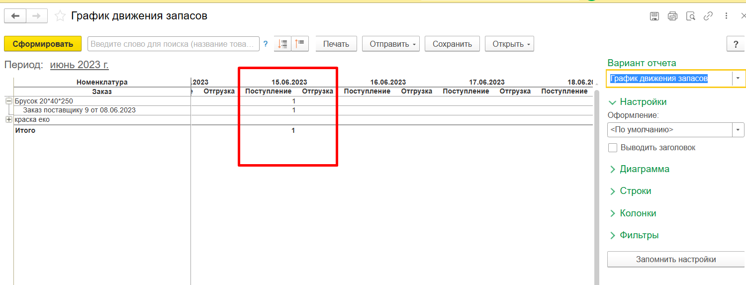 · График движения запасов – Данный отчет показывает график будущих приходов и расходов товаров. Детализируется отчет до документов заказов, в которых есть дата поступления товара или отгрузки товара в 1С;