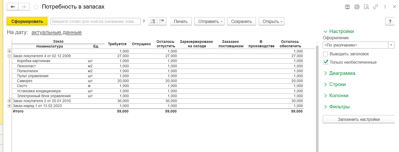 Потребность в запасах – данный отчет анализирует не отгруженных и не обеспеченные заказы и формирует список таковых;